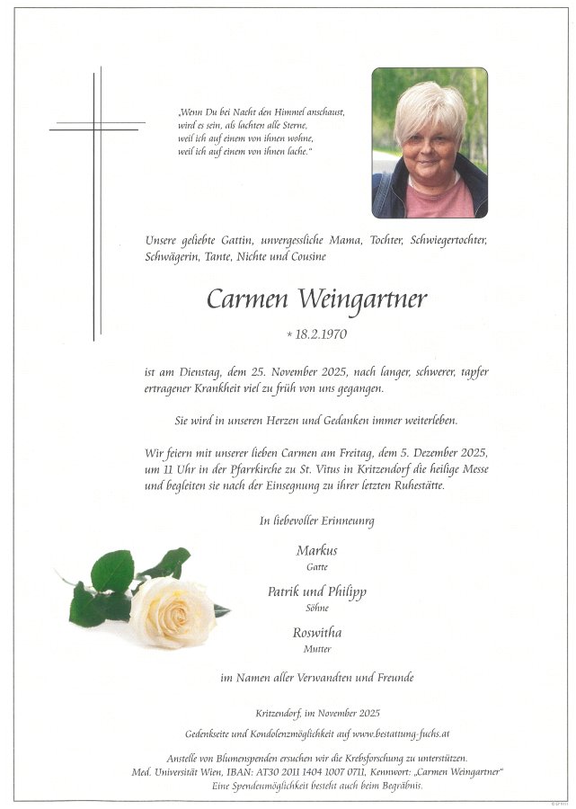 Liebe Carmen - es tut weh dich zu verlieren - aber es sind die Erinnerungen an das was dich ausmacht, dein herzliches Lächeln, deine lustigen Bemerkungen aber auch deine unermüdliche Unterstützung und Freundschaft die in meinem Herzen weiterleben werden. ... und eines Tages sehen wir uns wieder.