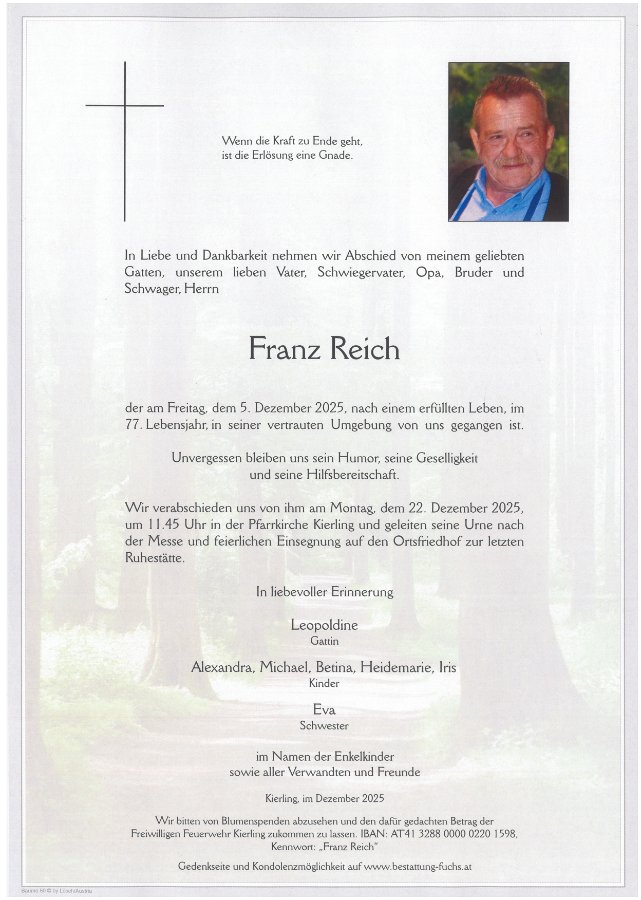 In tiefer Trauer nehme ich Abschied von meinem Schwiegervater Franz Reich.