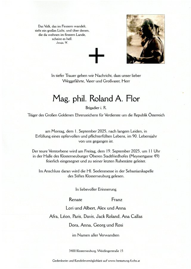 Ich möchte Ihnen hiermit mein aufrichtiges Beileid ausdrücken. Ich habe Mag. Flor immer sehr geschätzt wegen seines starken und glasklaren Charakters und wegen seiner vorbildlichen Aufrichtigkeit. Er sollte uns ein Vorbild bleiben.