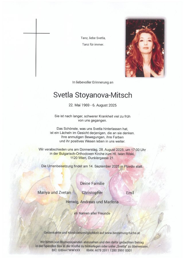 mein herzliches Beileid zu eurem schweren Verlust. In der kurzen Zeit, in der ich eure Familie kennenlernen durfte, habe ich bereits gespürt und gesehen, welch wunderbarer Mensch Svetla war. Ihre Stärke und ihre lebendige Persönlichkeit haben mich tief beeindruckt.